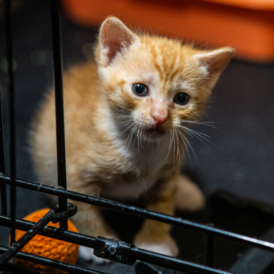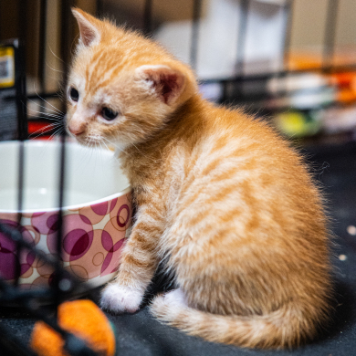 Котик-плюш с белыми лапками и усиками. Волонтёры зовут Карасика маленьким дедушкой. Самый крупный и самый громкий из всех котят — любит забираться по стенке манежа и кричать, чтобы никто не пропустил его триумф. Карасик хочет казаться взрослее и часто сидит на попе, как маленький взрослый котик.