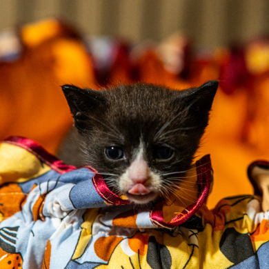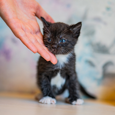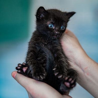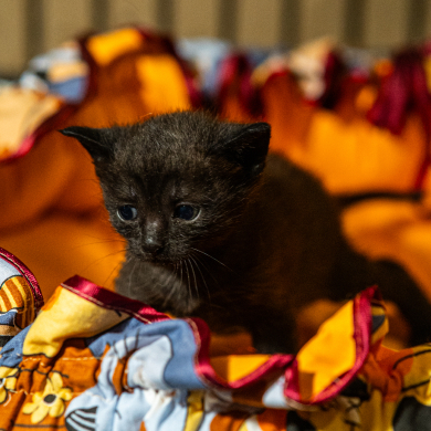 Котёнок в чёрной шубке и с глазами-льдинками. Самый маленький из братьев и сестёр. Любимое занятие Сомика — кусаться. Малыш обожает забираться в ладошку, ложиться там на спину и кусать пальцы человеков. Сомик быстрее всех прибегает, когда видит кого‑то из волонтёров. Очень ждёт, когда его заберут домой.